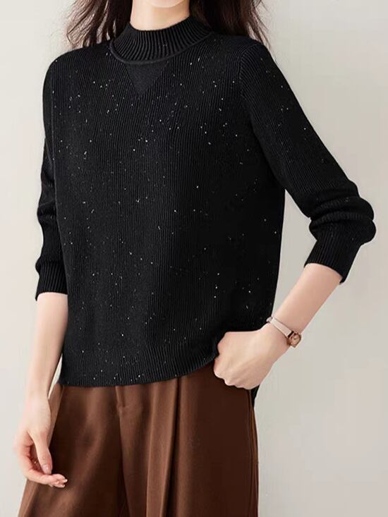 ハイネックの上品さとニットのやわらかさが共鳴する一枚。