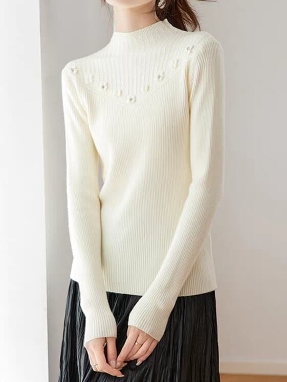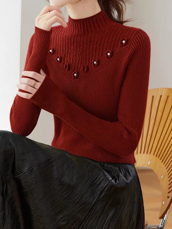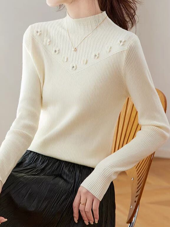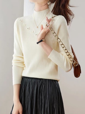 ボトルネックが首元を美しく整えながら、両肩から胸元へV字状に並ぶ花柄装飾が、顔まわりにやわらかな華やかさをプラスしてくれる一枚。