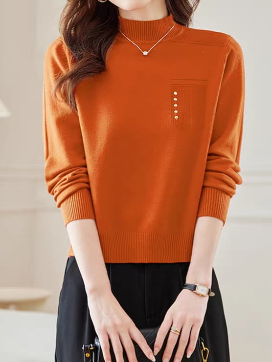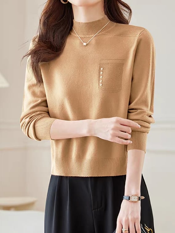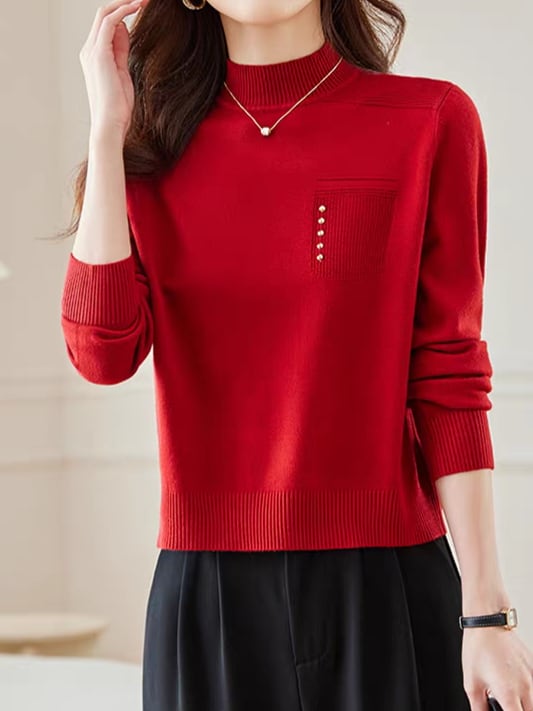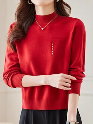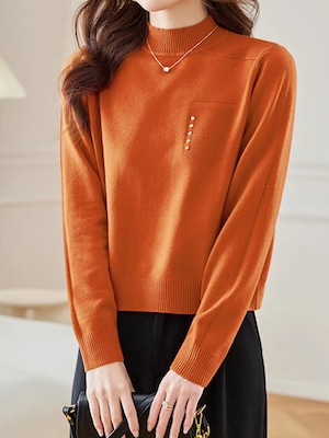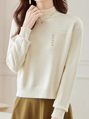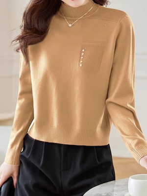 首元をやさしく包むハーフハイネックに、左胸のポケット風デザインがアクセントになったニットプルオーバー。